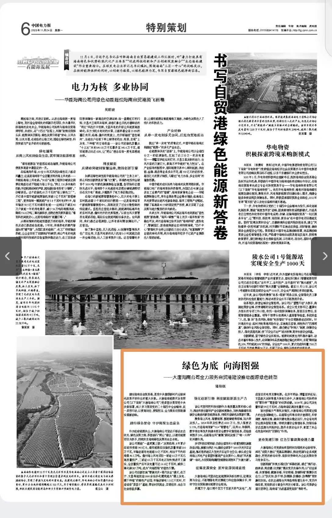 [中國電力報]2025-11-24?綠色為底 向海圖強 ——大唐海南公司全力服務自貿港建設推動能源綠色轉型