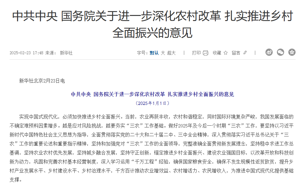 中共中央 國務院關于進一步深化農村改革 扎實推進鄉村全...